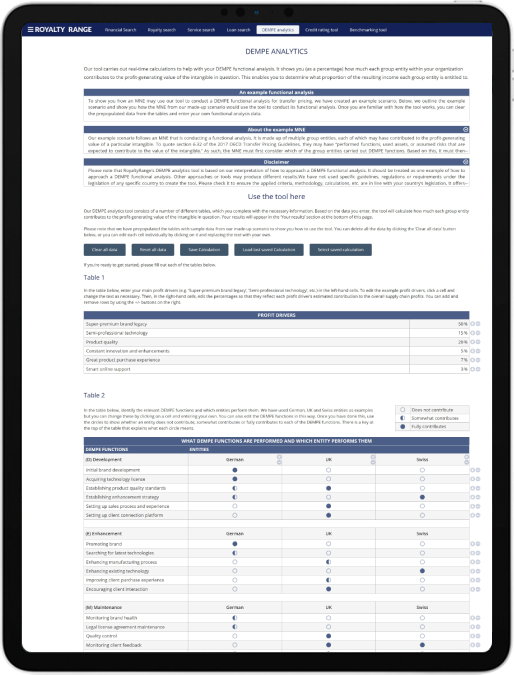 Our DEMPE analytics tool consists of several standardized input tables, which you complete with the necessary information. You save time by answering a standard set of questions, while the tool takes care of the process of estimation and calculation. To make the tool even more user-friendly, the tables are pre-populated with sample data from an example scenario so you know exactly how to use the product.