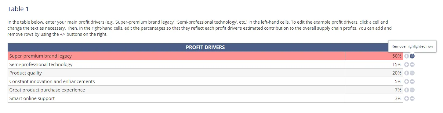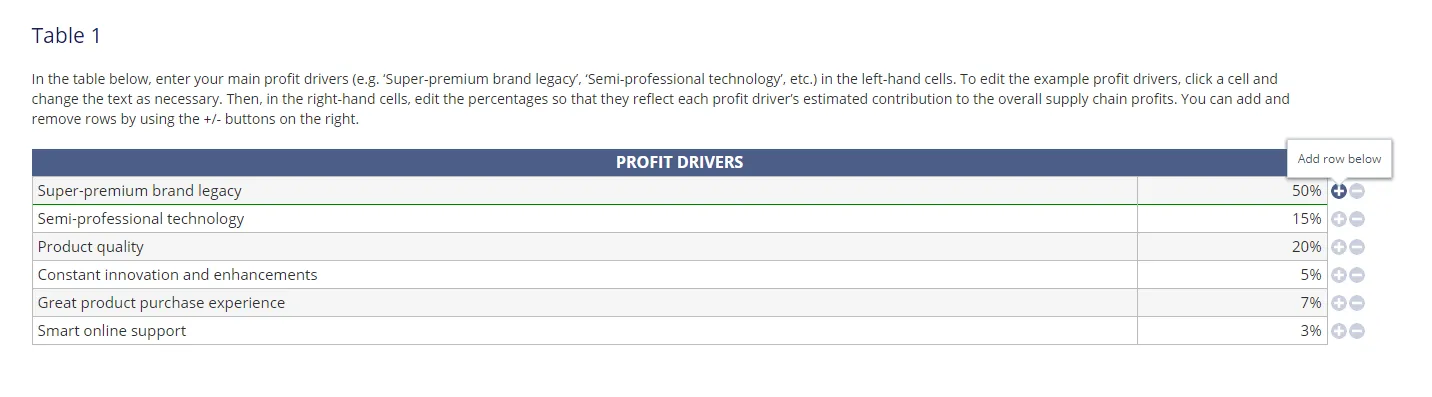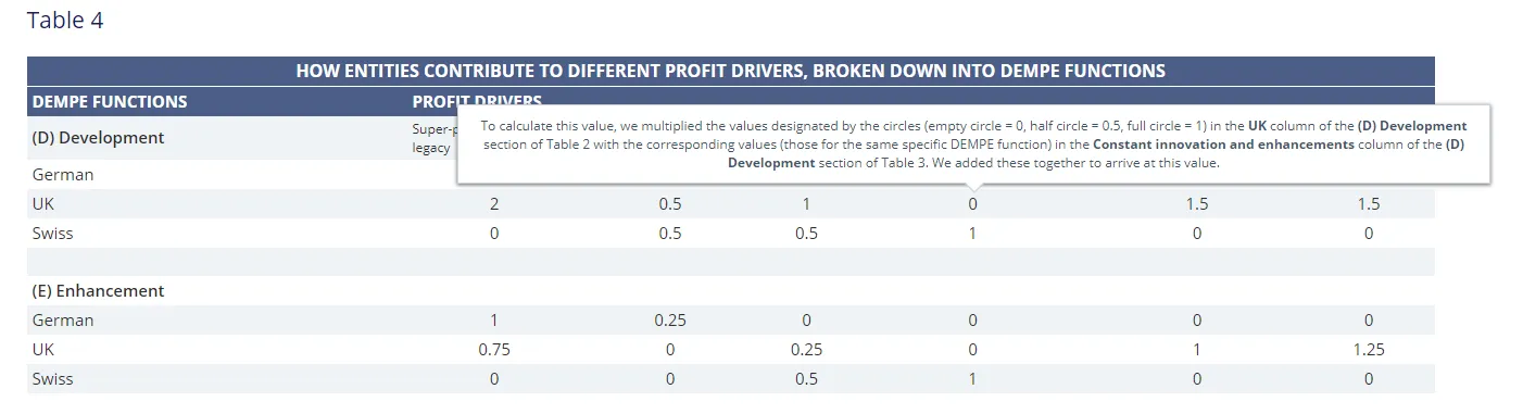 Our DEMPE analytics tool works by presenting you with a series of tables to fill out. Simply follow the instructions for each table, starting by editing the placeholder information to reflect the profit drivers, DEMPE functions and entities comprising the MNE.