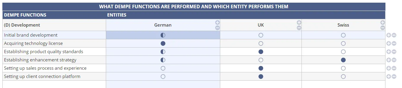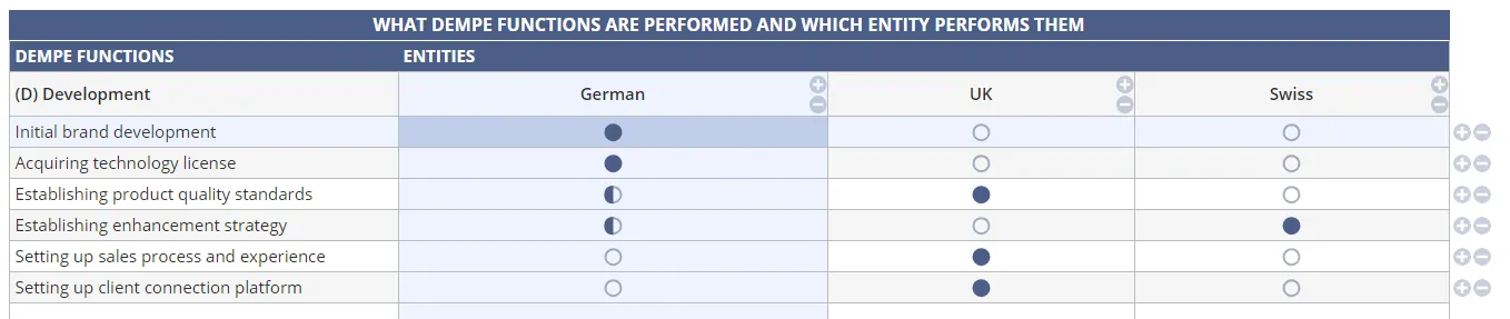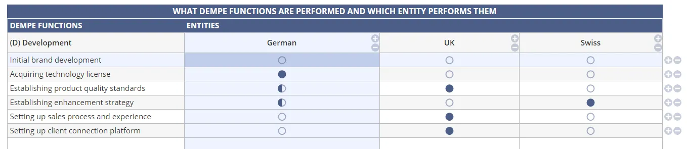 In Tables 2 and 3, you can edit the circles to show which entities contribute to – and to what extent – the performance of DEMPE functions (Table 2) and how these functions correlate with the profit drivers (Table 3).