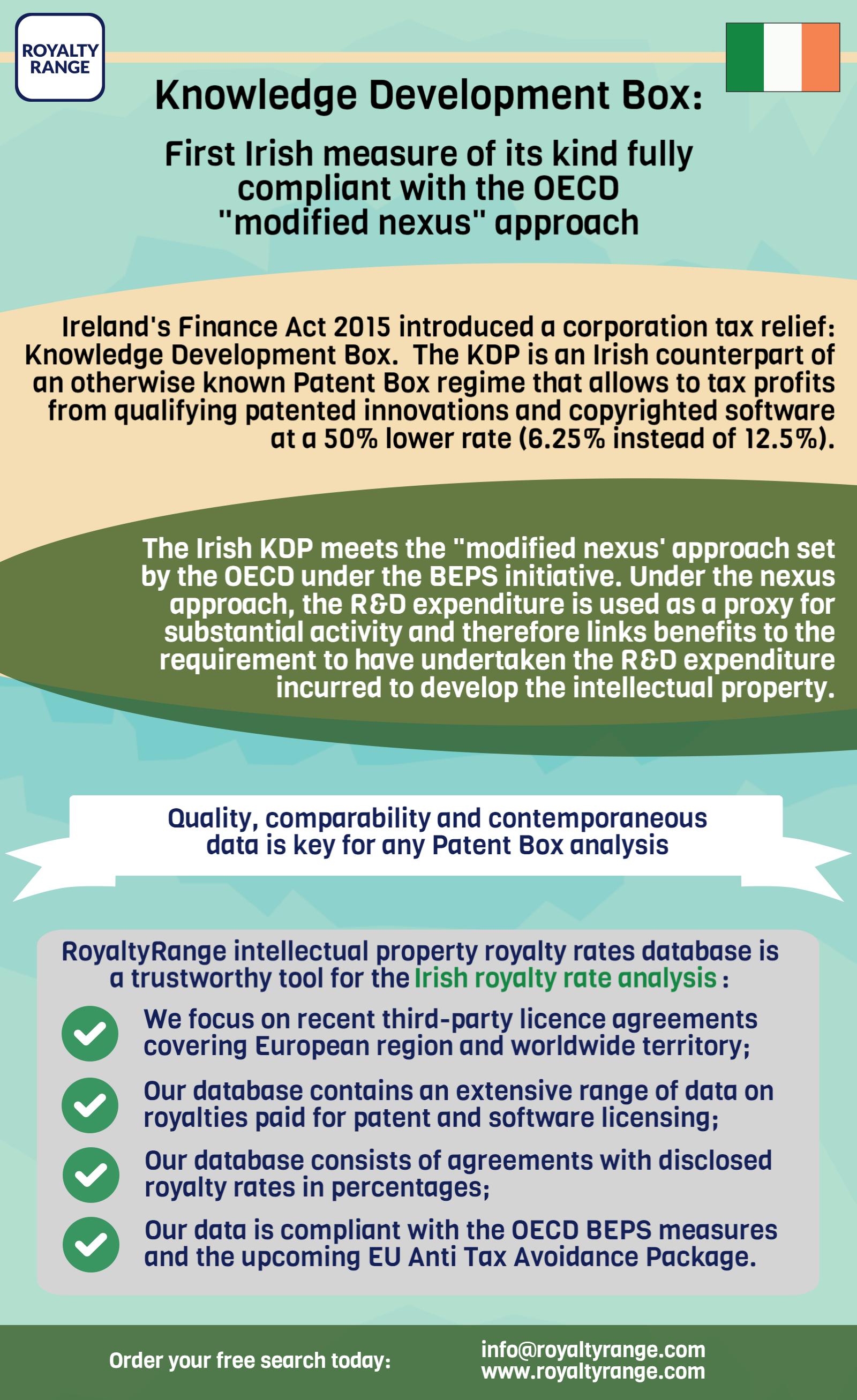 The Irish Knowledge Development Box meets the “modified nexus” approach set by the OECD under the Base erosion and profit shifting (BEPS) initiative. Under the nexus approach, the R&D expenditure is used as a proxy for substantial activity and therefore links benefits to the requirement to have undertaken the R&D expenditure incurred to develop the intellectual property.