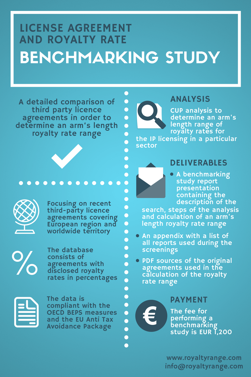 Our benchmarking study is a detailed comparison of publicly available licence agreements and royalty rates in order to determine an arm’s length (market) royalty rate range for the specific products or services. Although the main purpose of the benchmarking study is to identify external transactions to assess whether intercompany transactions comply with the arm’s length principle, the data provided in our benchmarking study reports may be useful for purposes other than transfer pricing compliance, such as setting reasonable royalty rates, negotiation of licence agreements, intellectual property valuation, and consulting.