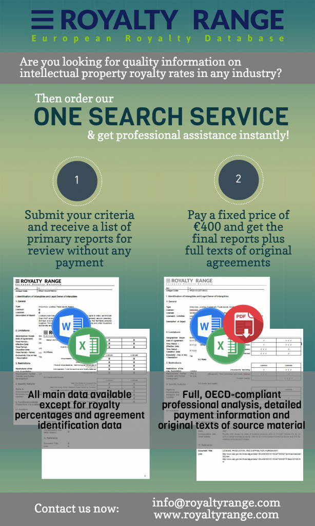 Are you looking for quality information on intellectual property royalty rates in any industry? Then order our one search service and receive professional assistance instantly!
