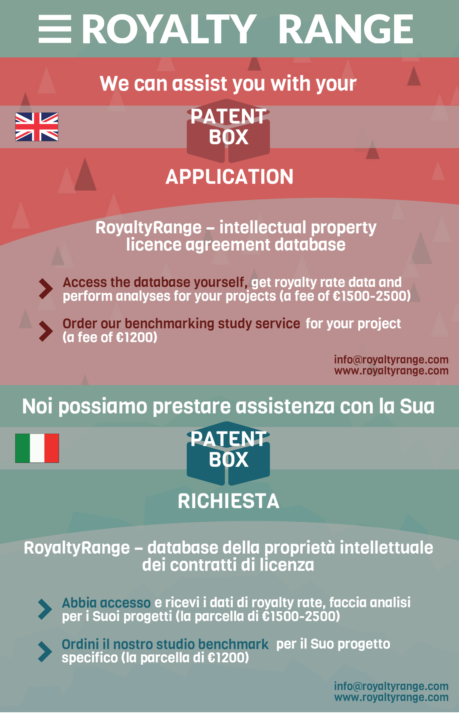 The RoyaltyRange intellectual property licence agreement database is the perfect tool with regards to your patent box application. We can assist you with your endeavours by offering our quality services. Make sure to use only the most advanced tools and premium-quality data for your projects! You may access the database yourself, get royalty rate data and perform analyses for your projects (read more), or order our benchmarking study service for your specific project (read more).
