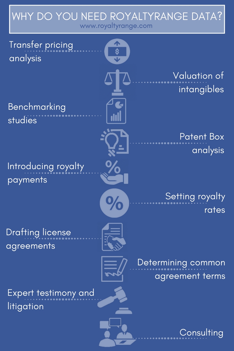 RoyaltyRange is a premier-quality intellectual property and royalty rates database. We provide easy-to-use, reliable and detailed royalty rates data for organizations around the world that are using intangible property to introduce, negotiate or amend license agreements, perform valuation of intangibles, or that want to assess their compliance for transfer pricing purposes. Our database contains high-quality, detailed and structured data on recent license agreements and industry-specific intangible property licensing terms.